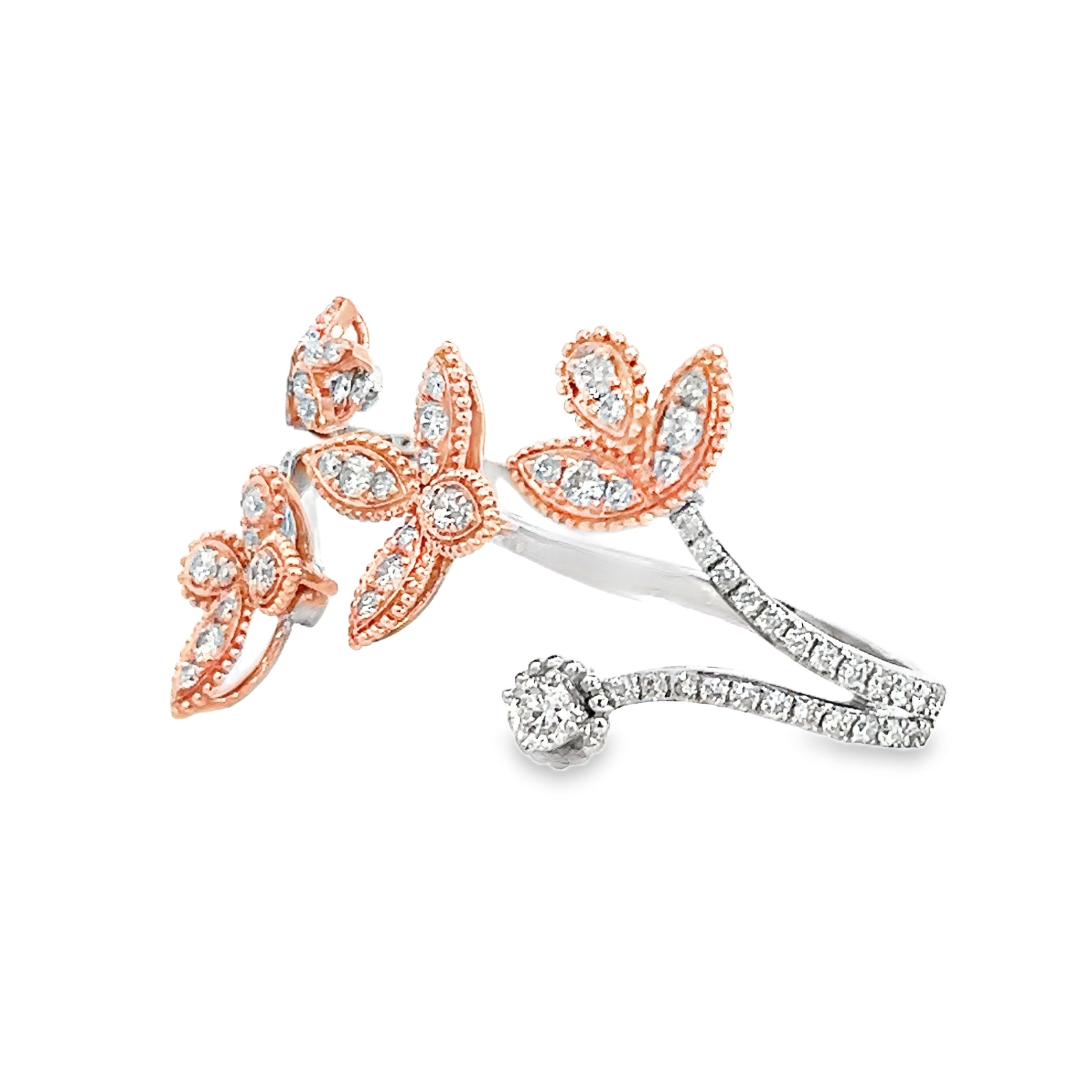 This elegant 2-finger open ring showcases a beautiful flower and leaf design crafted in 14k rose and white gold, featuring a stunning .75ct F VS2 round diamond that adds captivating brilliance to your style.