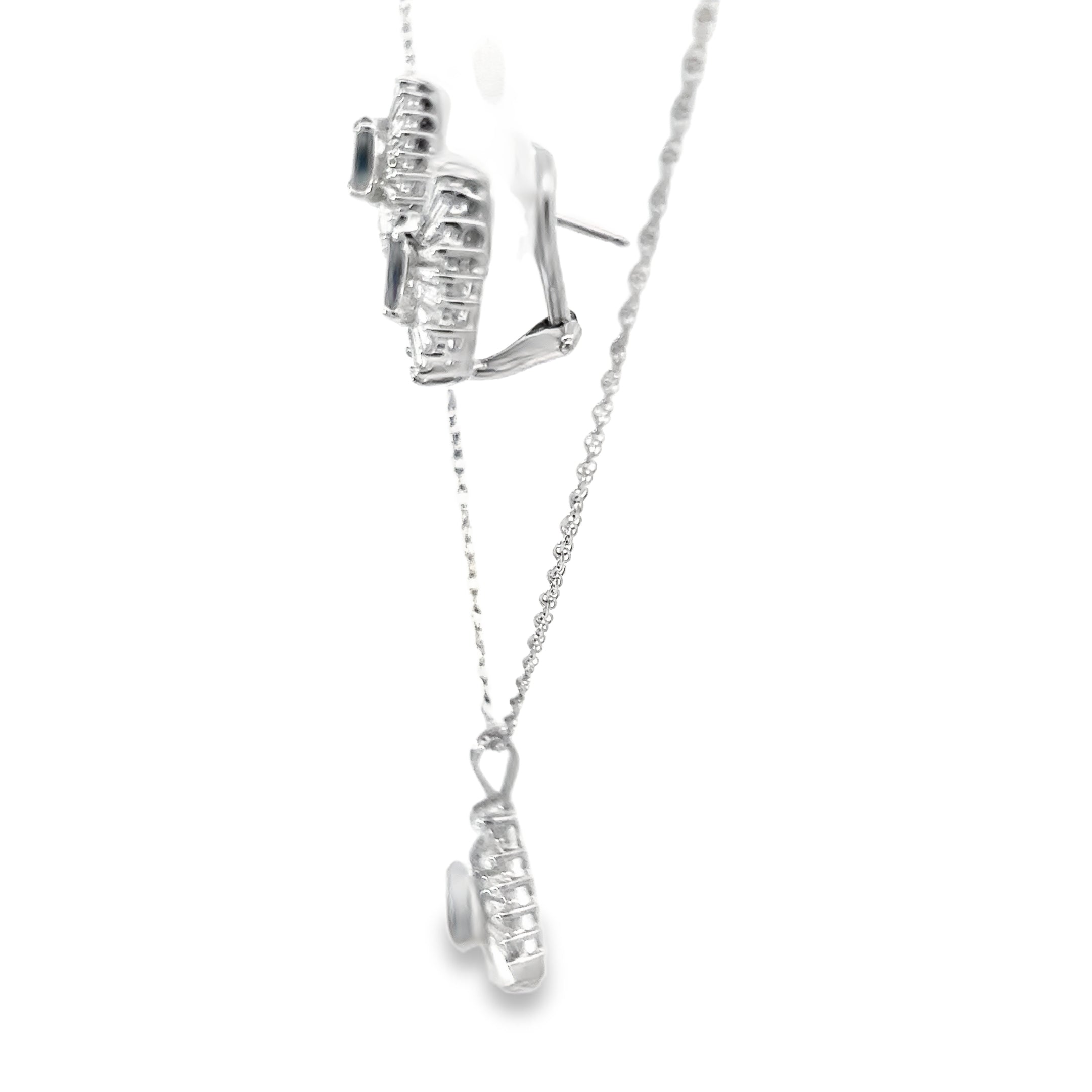 14k White Gold 1.50ct G VS2 Baguette Shape Diamond / 1.20ct Blue Sapphire Pear Shape Ballerina Setting Omega Clip Back Earrings and 14k White Gold 1.00ct G VS2 Baguette Shape Diamond/ .80ct Blue Sapphire Pear Shape Pendant Set