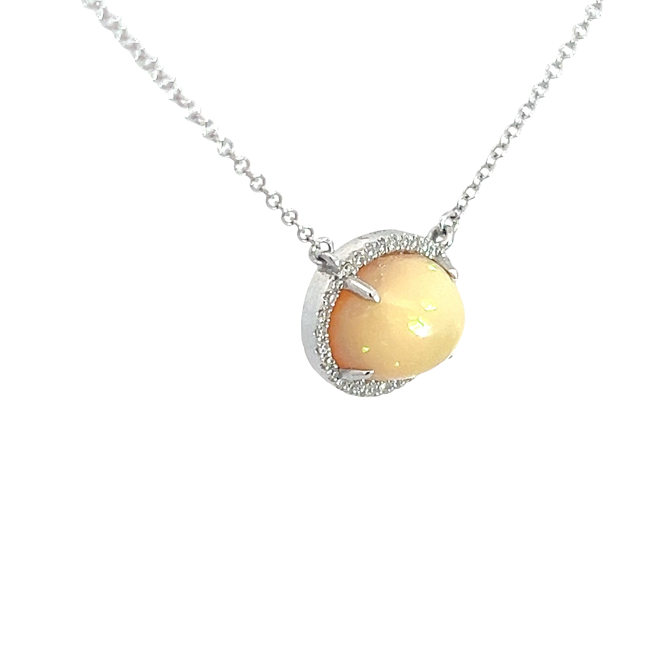 This elegant pendant features a 14k white gold setting showcasing a .15ct G SI1 round diamond paired with a stunning Ethiopian opal, creating a captivating and sophisticated accessory.