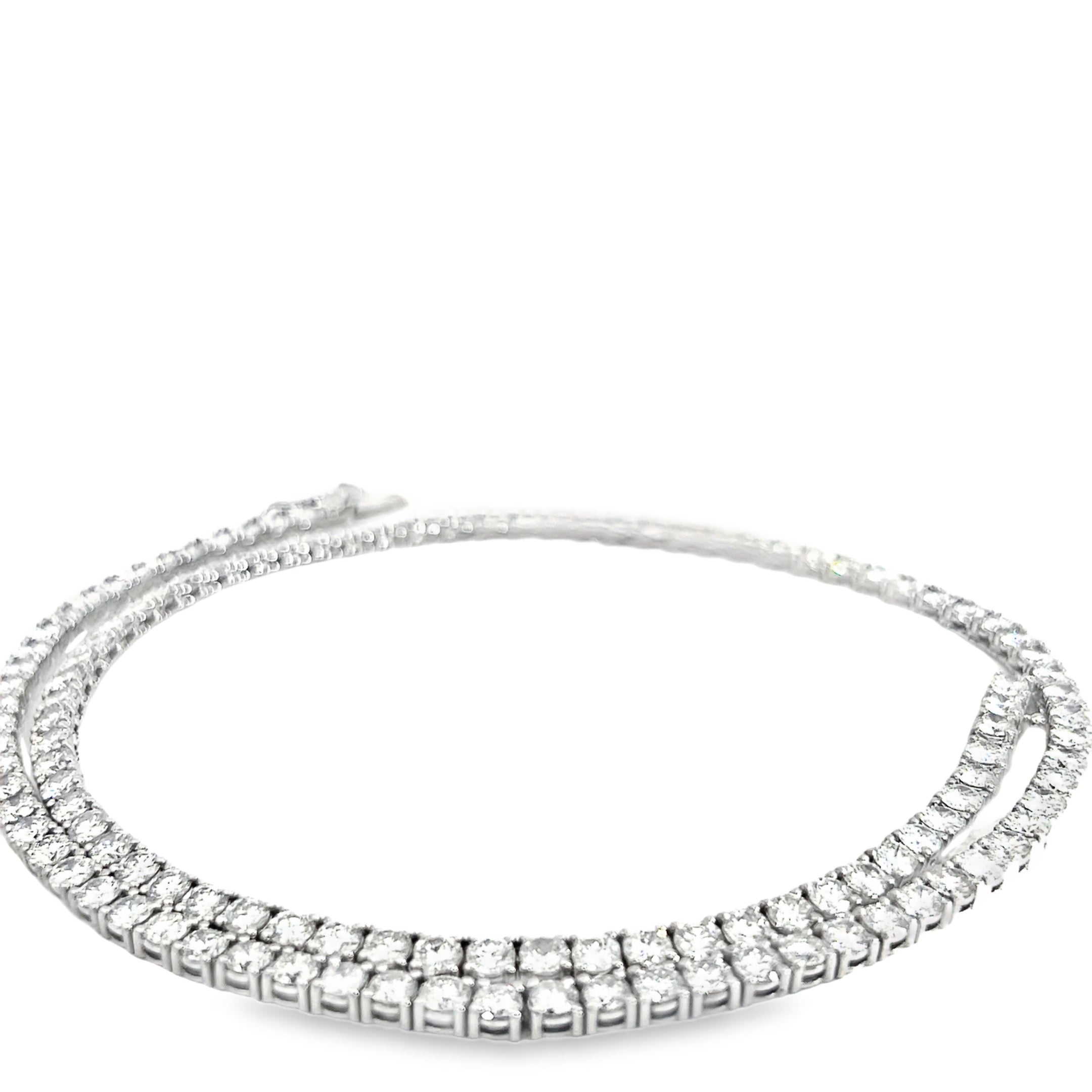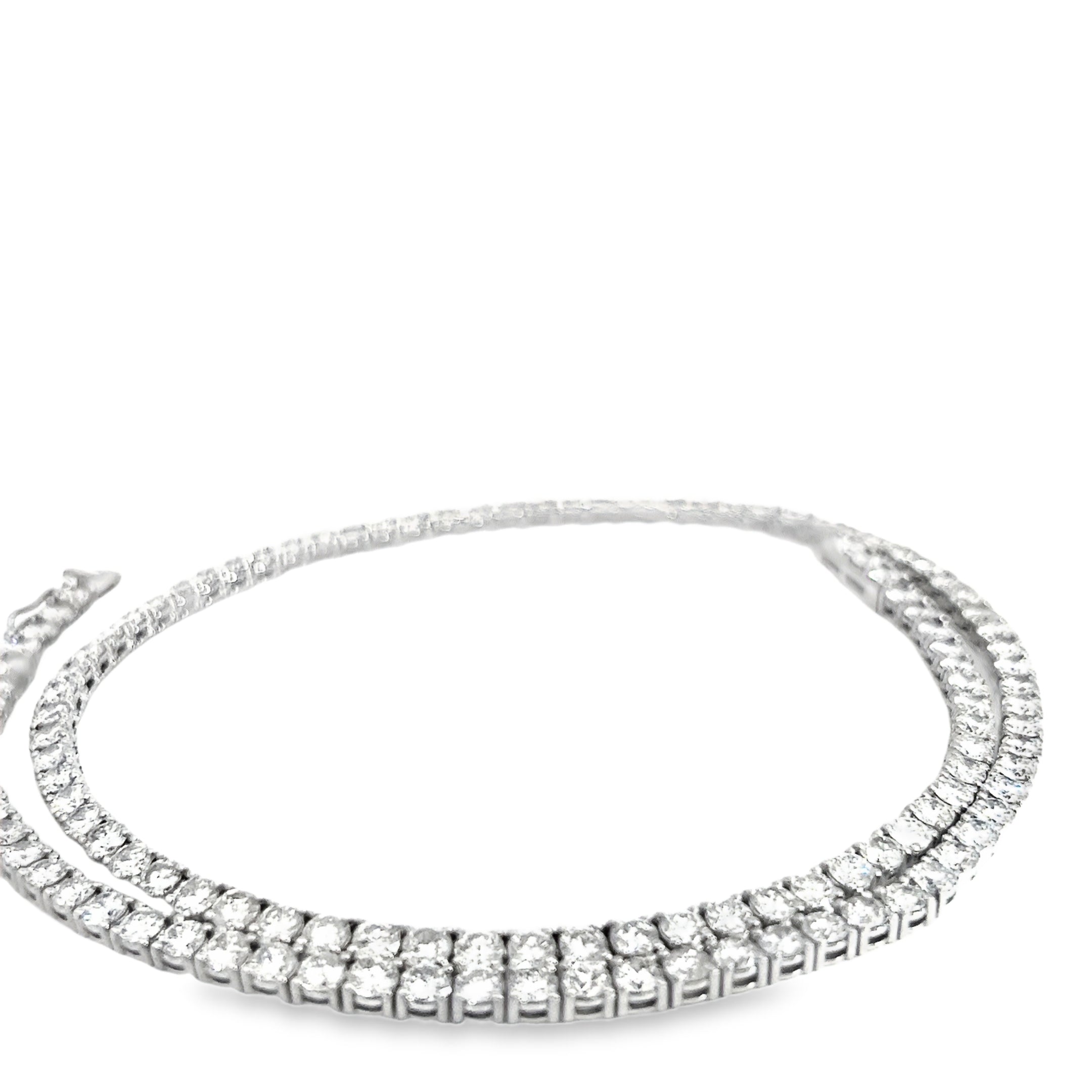 Elevate your elegance with this 18-inch tennis necklace crafted from 14k white gold, featuring 19.65 carats of dazzling F/G color round diamonds with VS2/SI1 clarity, designed to captivate every gaze.