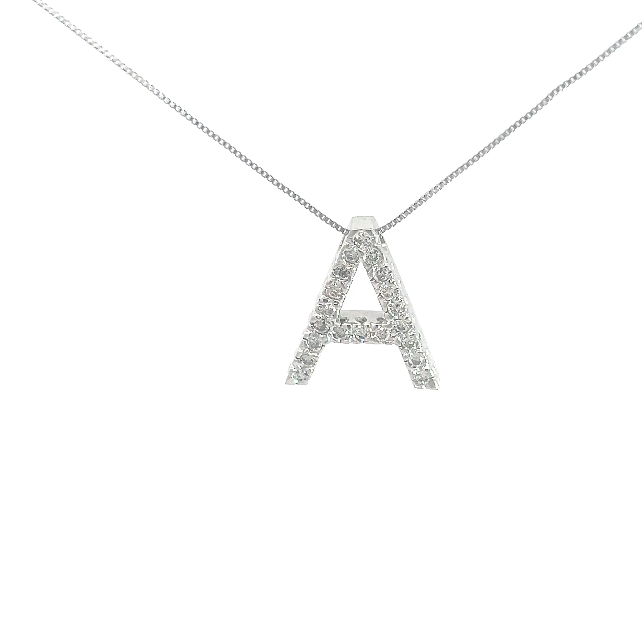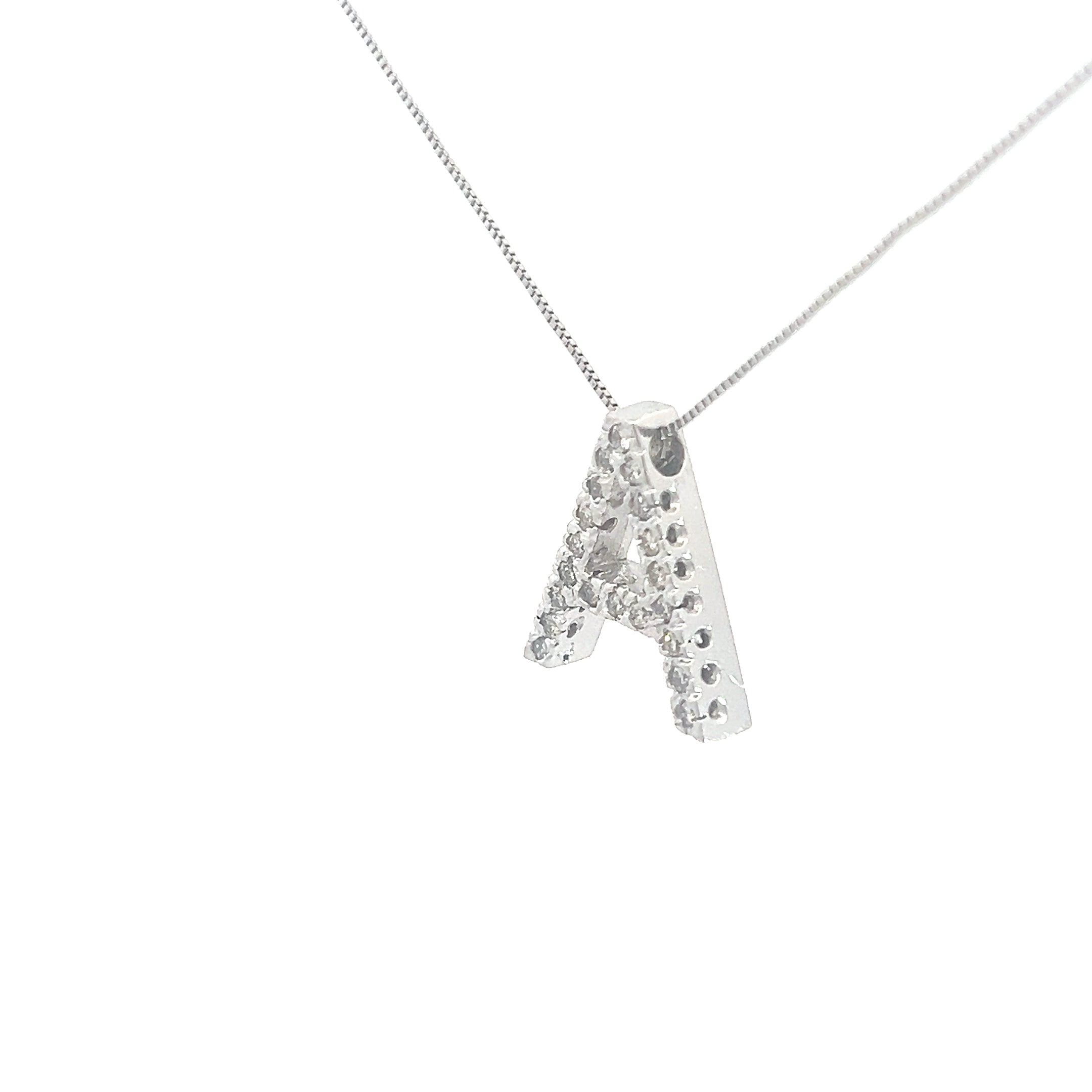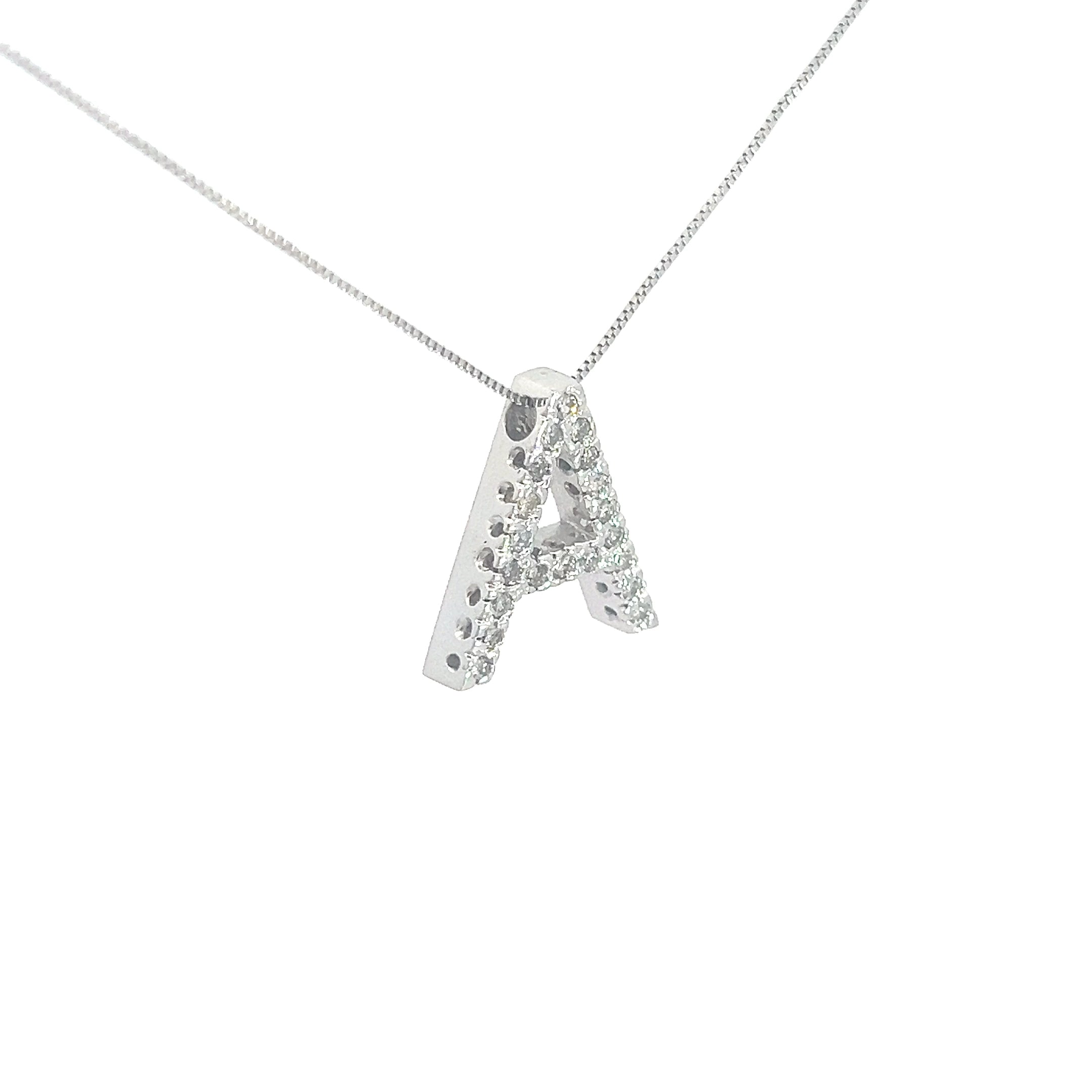 Crafted in 14k white gold, this 3/4" by 1/2" necklace features a bold block letter "A" adorned with sparkling G color, VS2 clarity round diamonds, weighing 4.3 grams for a stunning and durable accessory.