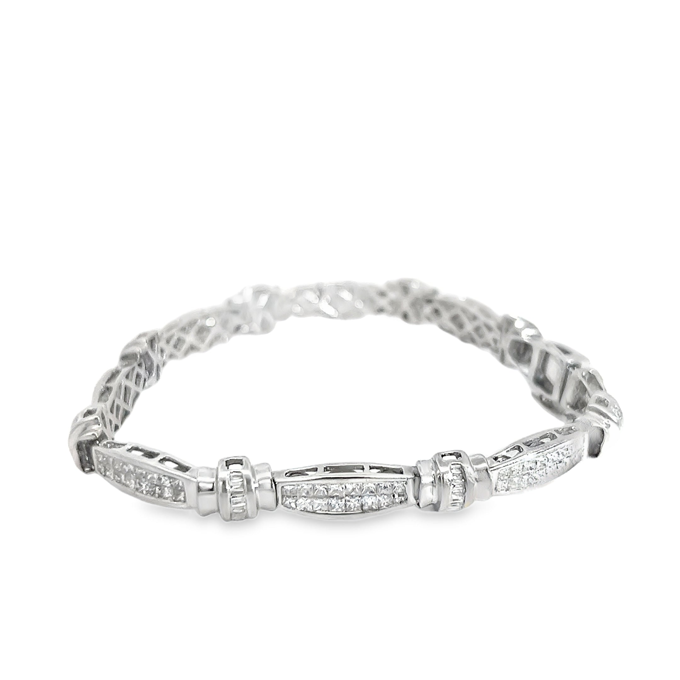 Elevate your style with this 14k white gold bracelet featuring 4.00 carats of G color, VS2 clarity diamonds. Expertly crafted with an invisible setting, it showcases dazzling princess cut and baguette diamonds for a seamless, luxurious look.