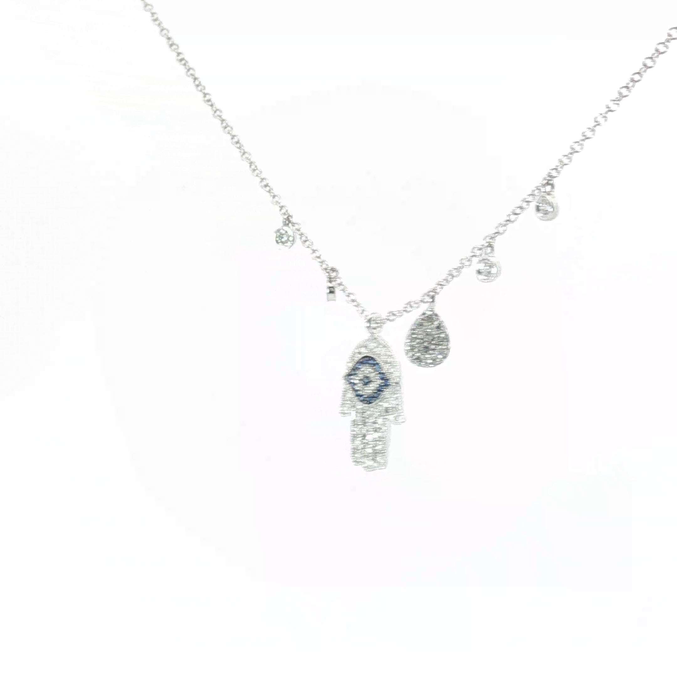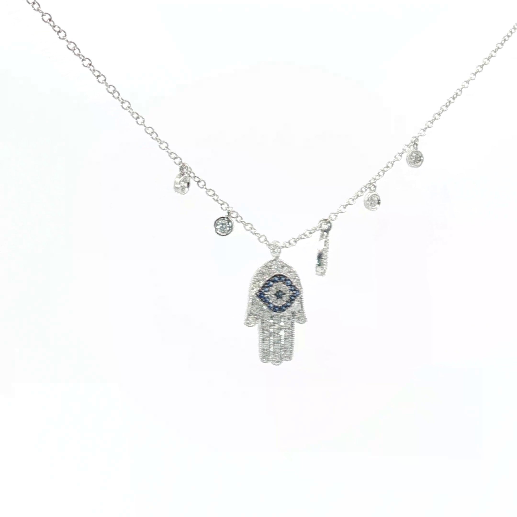 14k White Gold .50ct G VS2 Round Diamond and Round Blue Sapphire Khamsa Evil Eye Diamond Necklace
