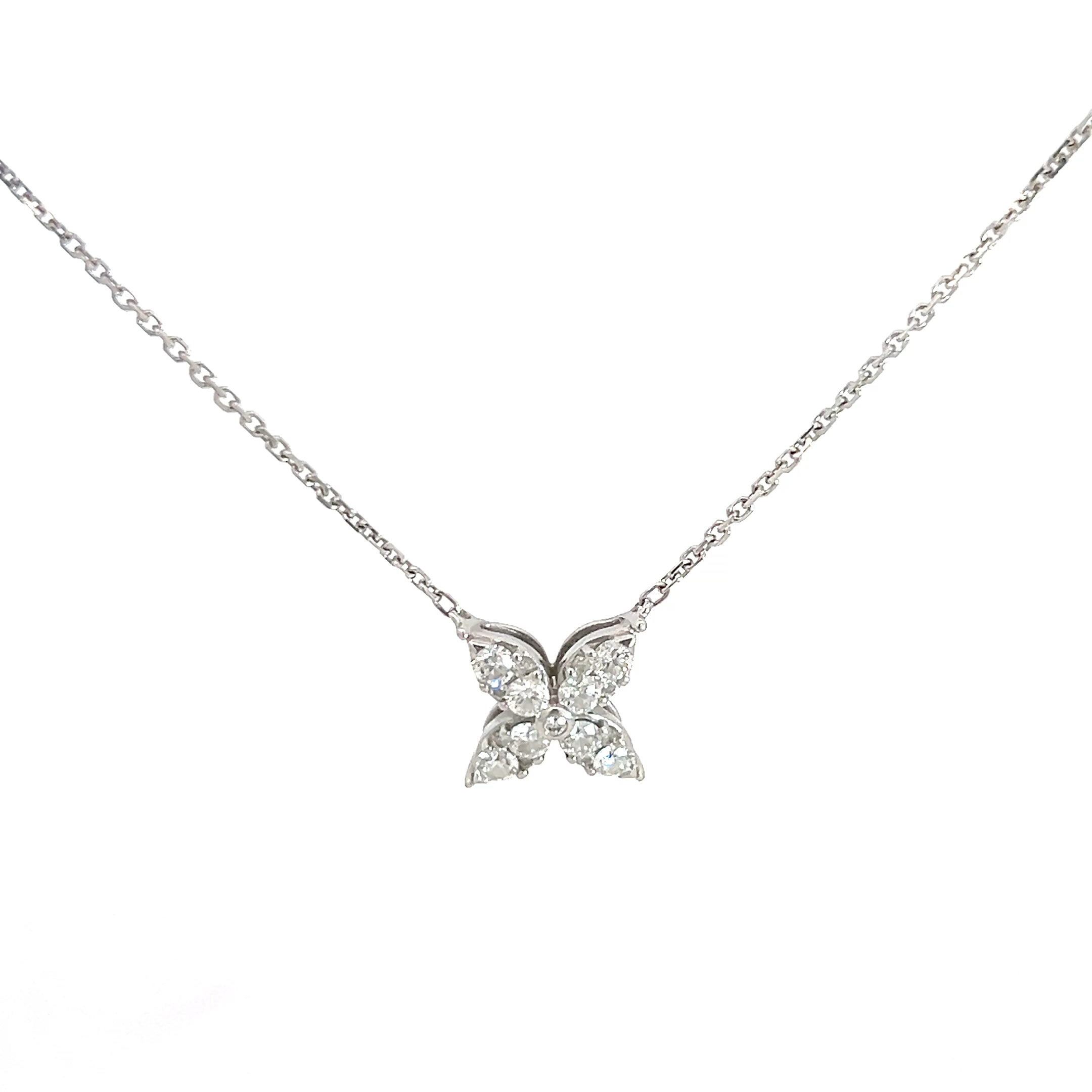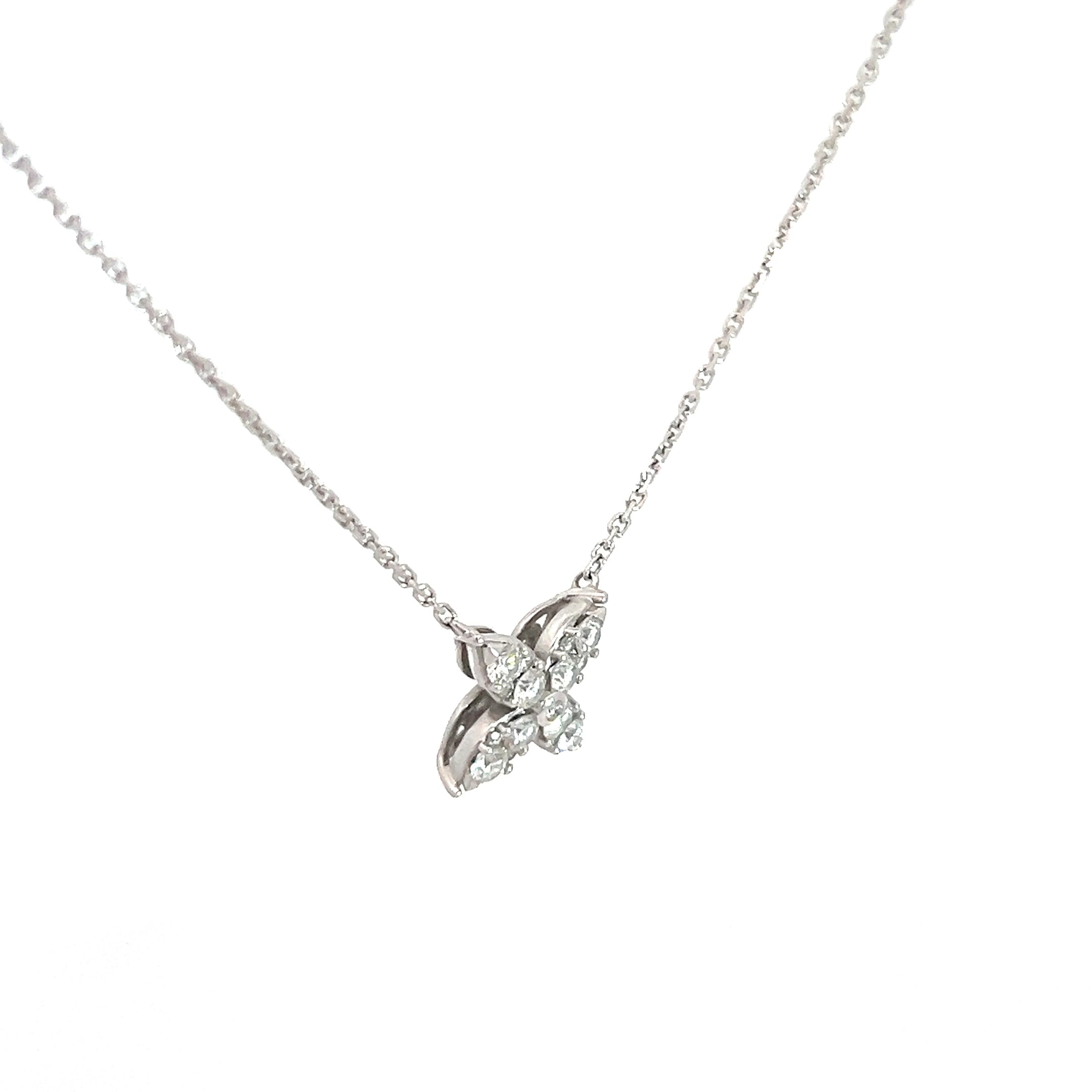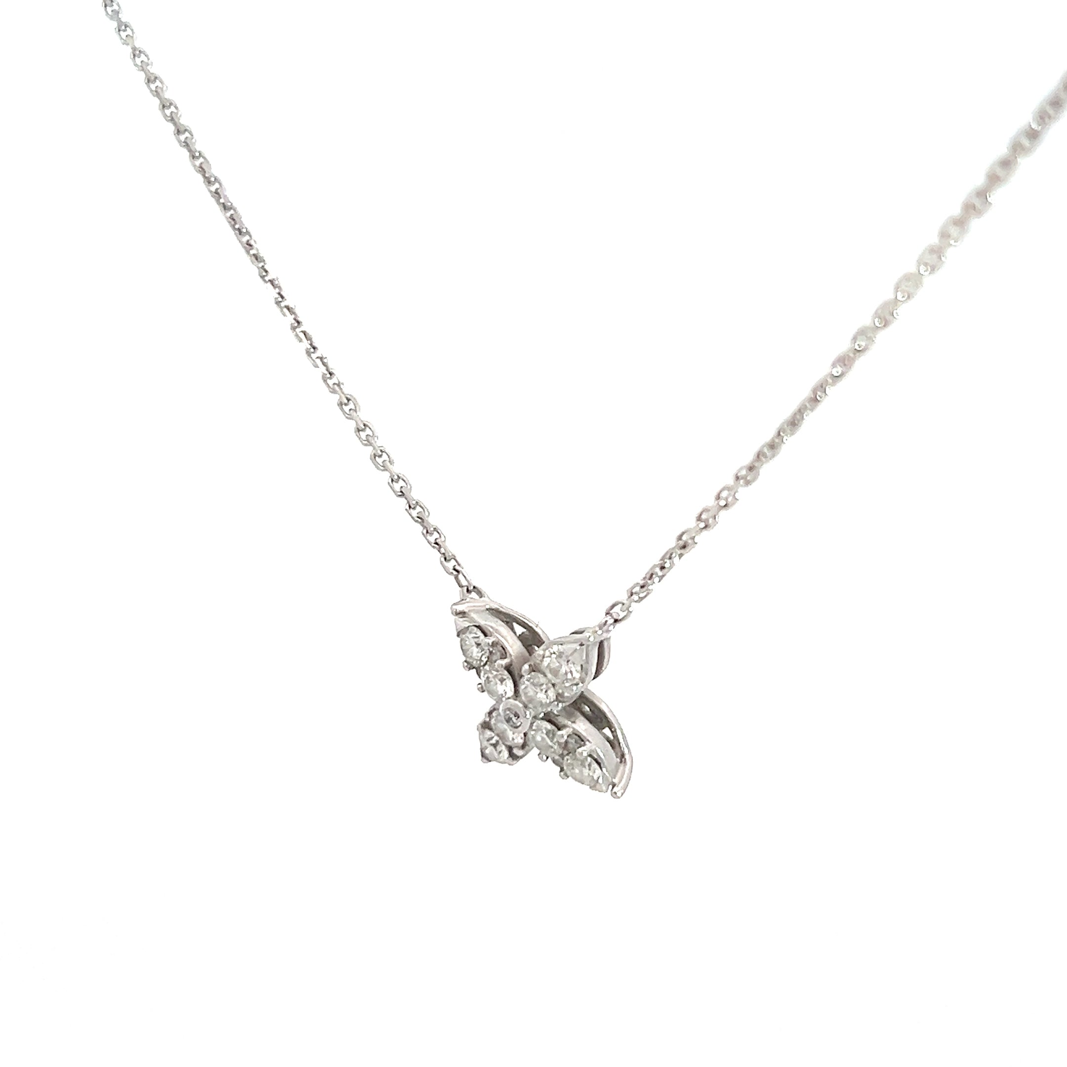 Elevate your elegance with this 14k white gold flower pendant featuring a sparkling .50ct G VS2 round diamond, paired beautifully with a delicate diamond by the yard necklace. This exquisite piece is perfect for adding timeless brilliance to any outfit.
