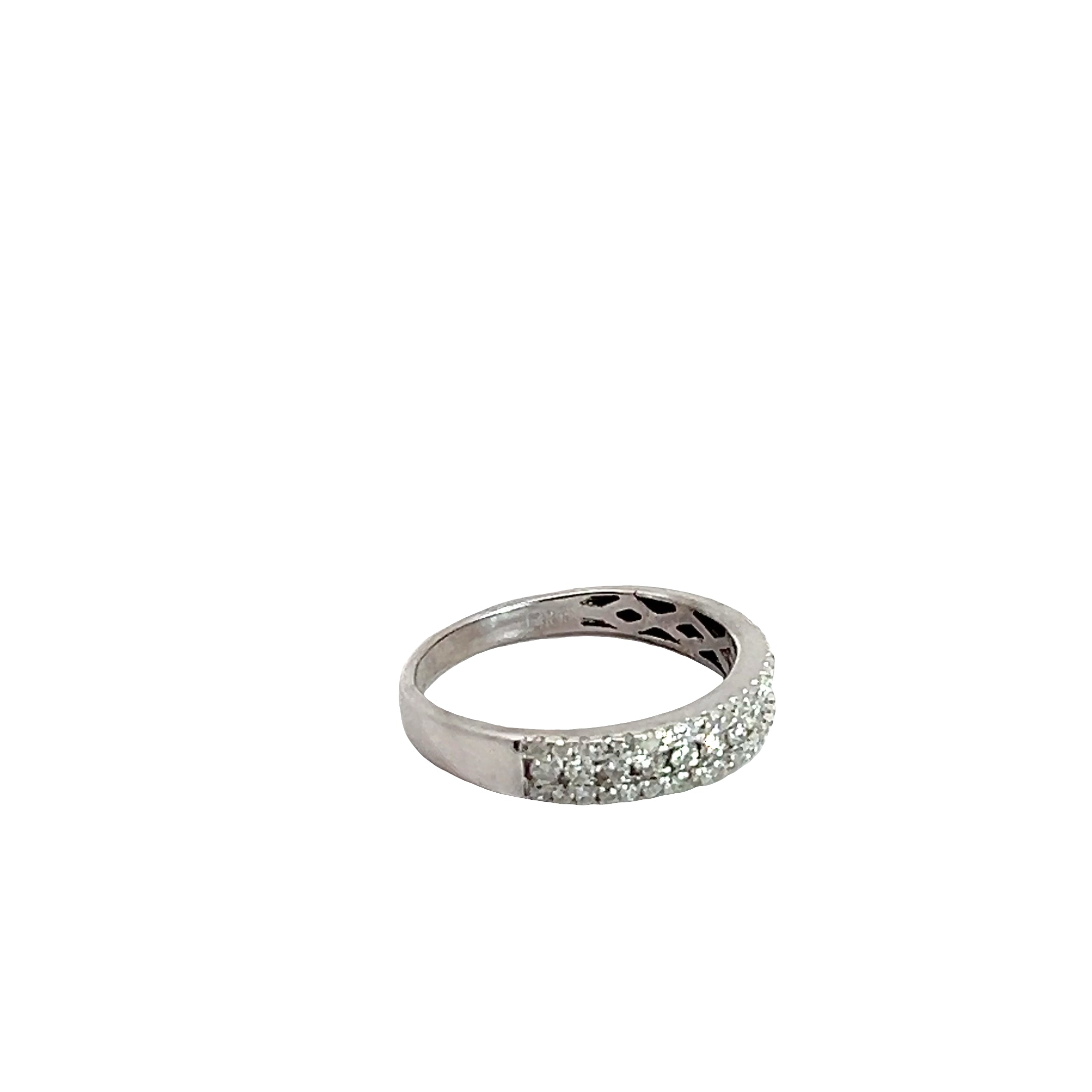 Elevate your elegance with this 14k white gold band featuring a dazzling .65-carat G color, VS2 clarity round diamond centerpiece, complemented by three brilliant rows of diamonds for a stunning, sophisticated sparkle.