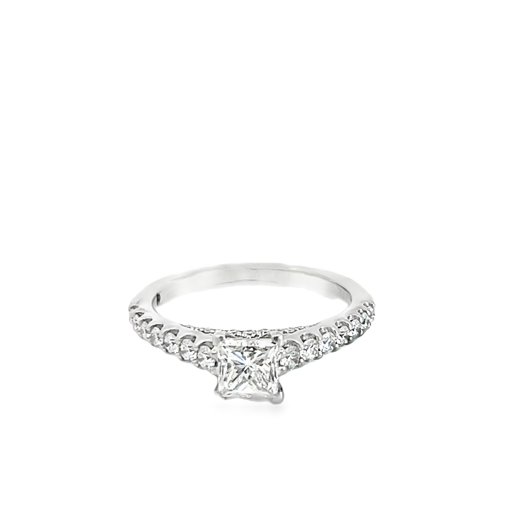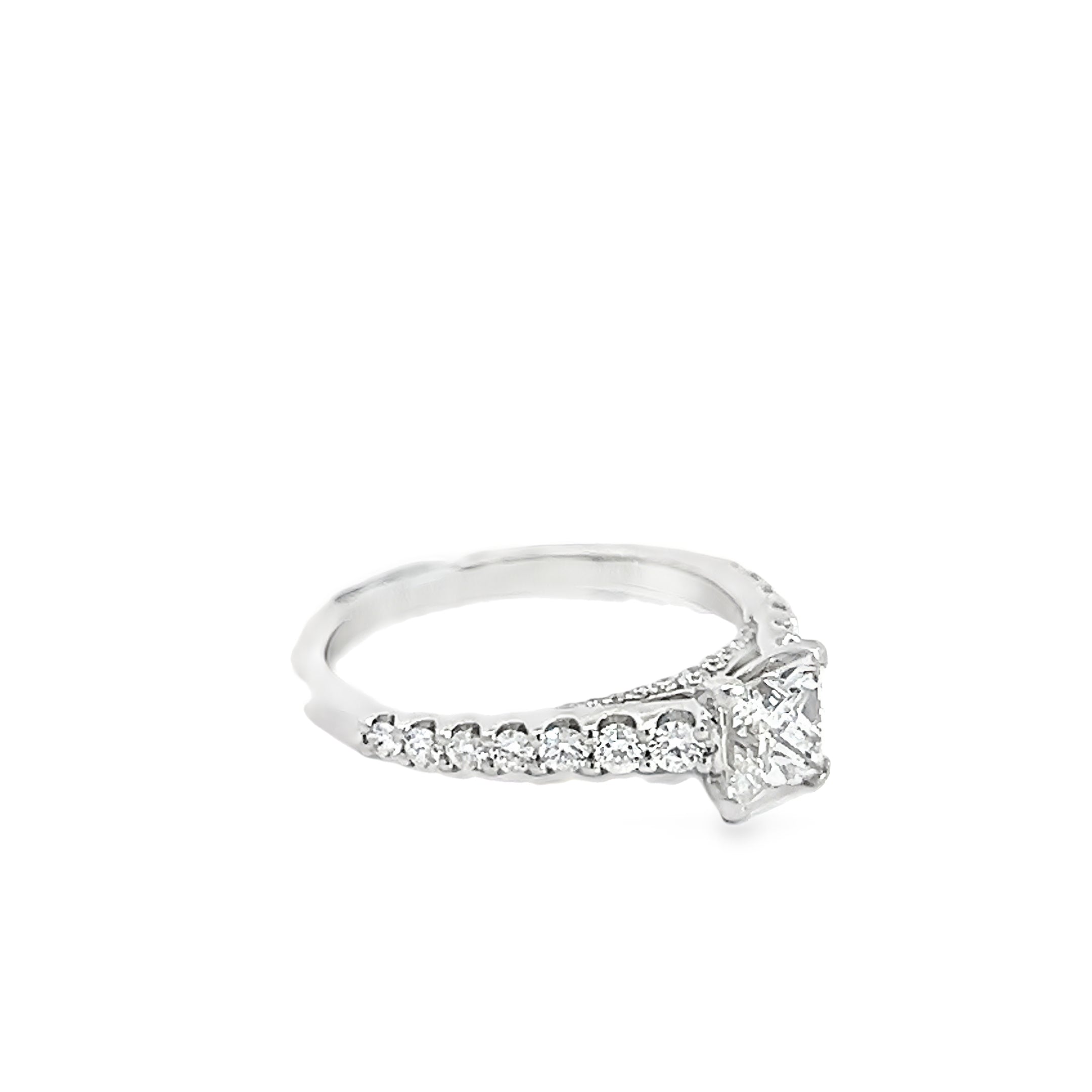 Experience the timeless elegance of our stunning engagement ring, featuring a 14k white gold band and dazzling .84ct G VS2 princess cut diamond, complemented by a .65ct F VS2 round diamond. Certified by GIA, this ring is a true symbol of love and commitment. Order now to make your special moment unforgettable!