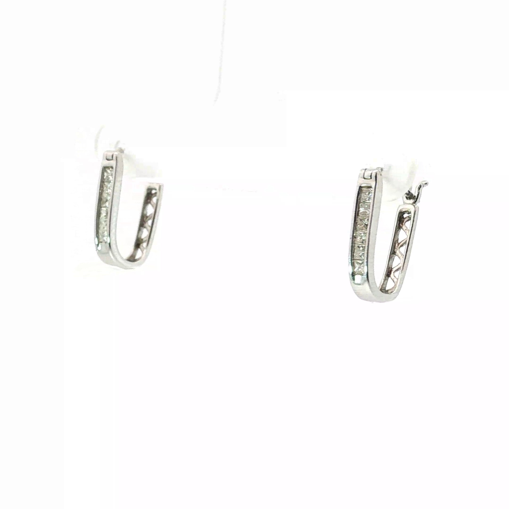 Elevate your style with these 14k white gold huggie earrings, featuring sparkling round cubic zirconia stones set in a sleek squared design. Perfect for adding a touch of elegance to any outfit.