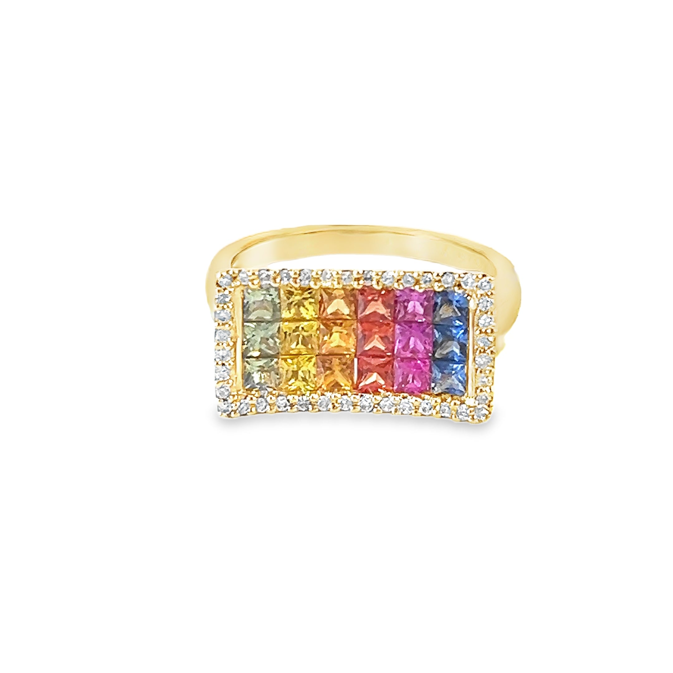 Transport yourself to a world of vibrant hues and shimmering brilliance with our 14k Yellow Gold 2.00ct Princess Cut Multicolored Invisible Set Sapphire /.35ct G VS2 Round Diamond Ring. This exquisite piece is carefully crafted with the finest materials, radiating luxury and elegance. Embrace the magic of this ring and adorn yourself with its mesmerizing beauty.