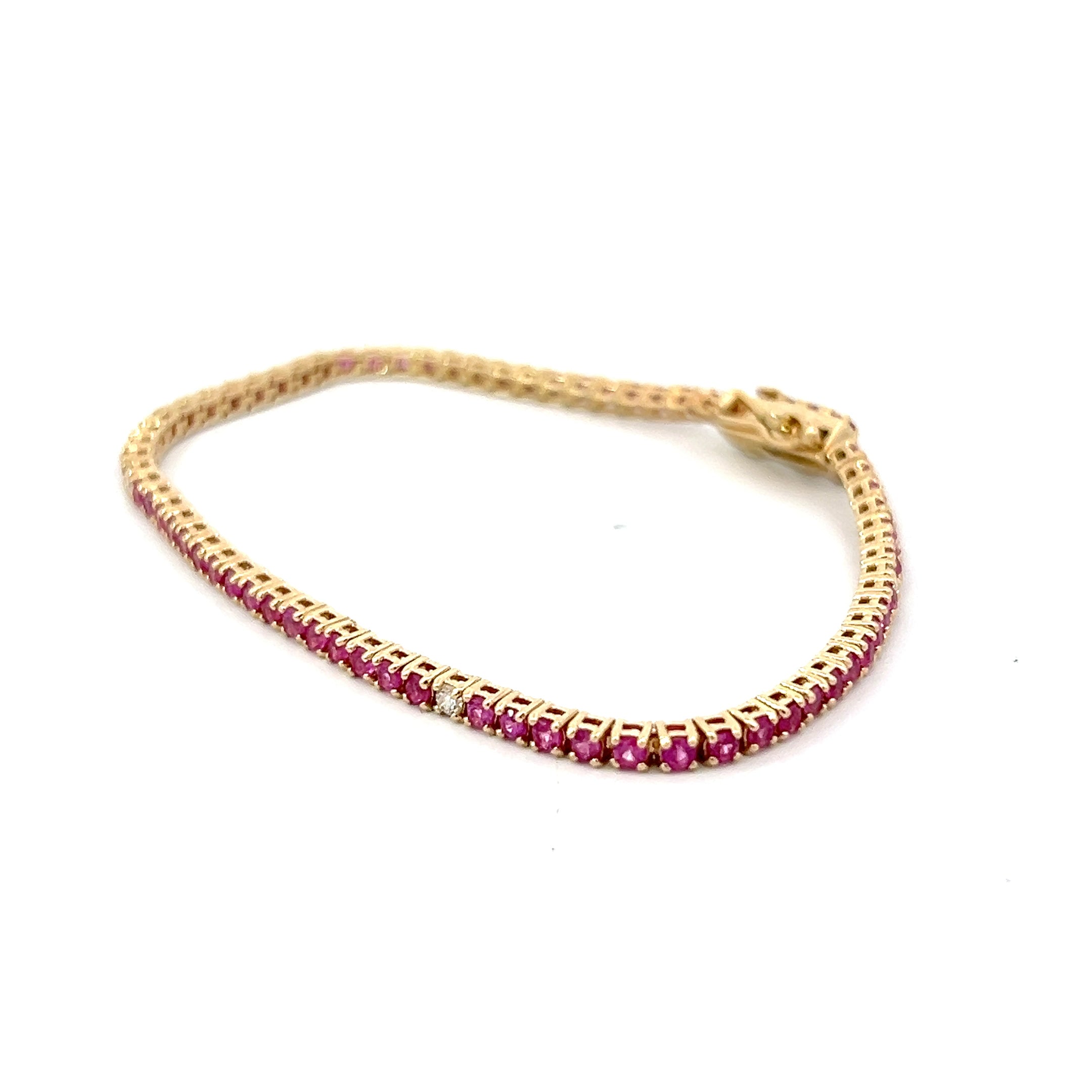 This elegant bracelet features 2.25 carats of vibrant pink sapphires set in 14k yellow gold, complemented by .18 carats of G VS2 round diamonds. A stunning piece that adds a touch of luxury and color to any outfit.