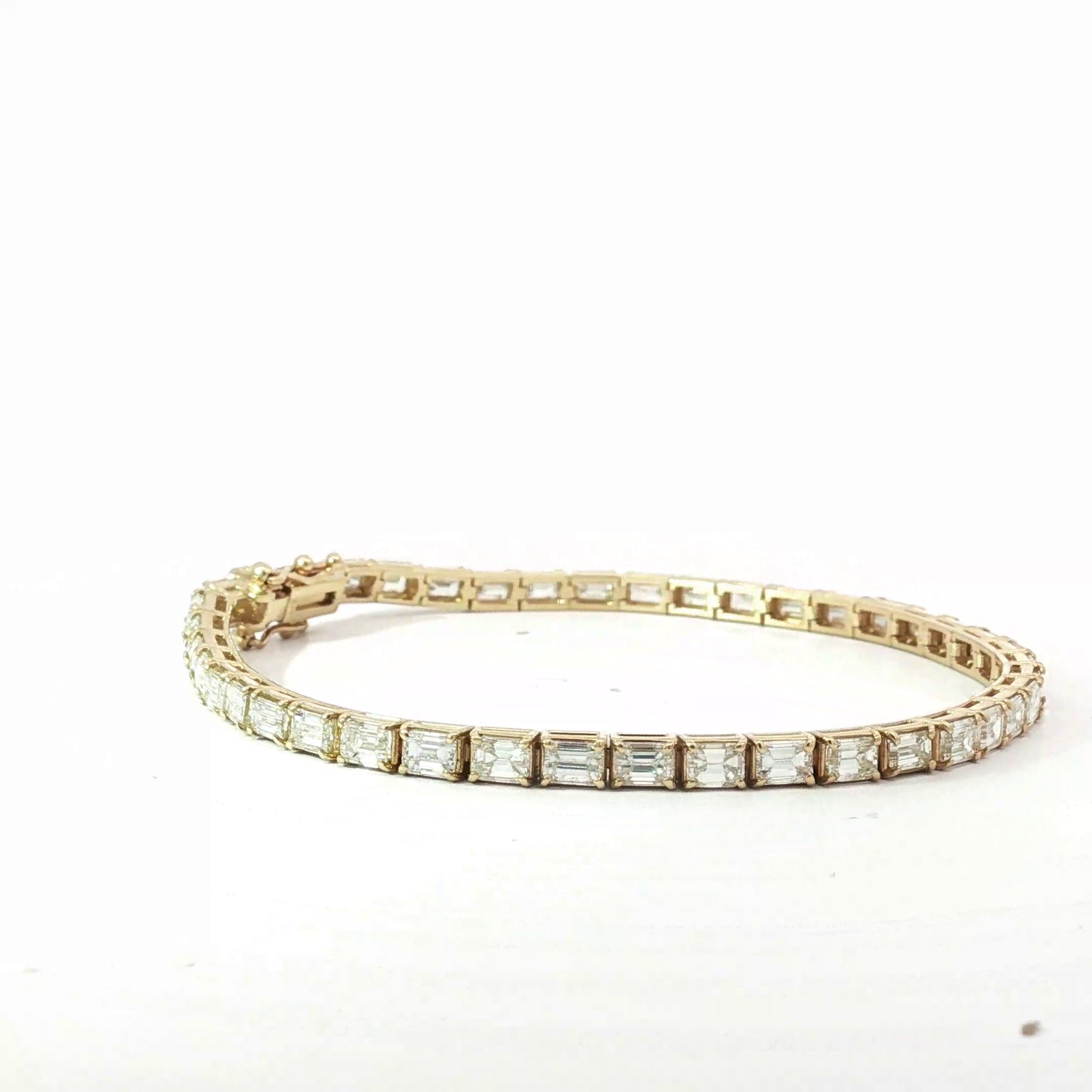 This 14k yellow gold tennis bracelet features an impressive 8.43-carat total weight of H color, VS2 clarity emerald-cut diamonds set in an elegant east-west orientation, combining timeless luxury with a modern twist.