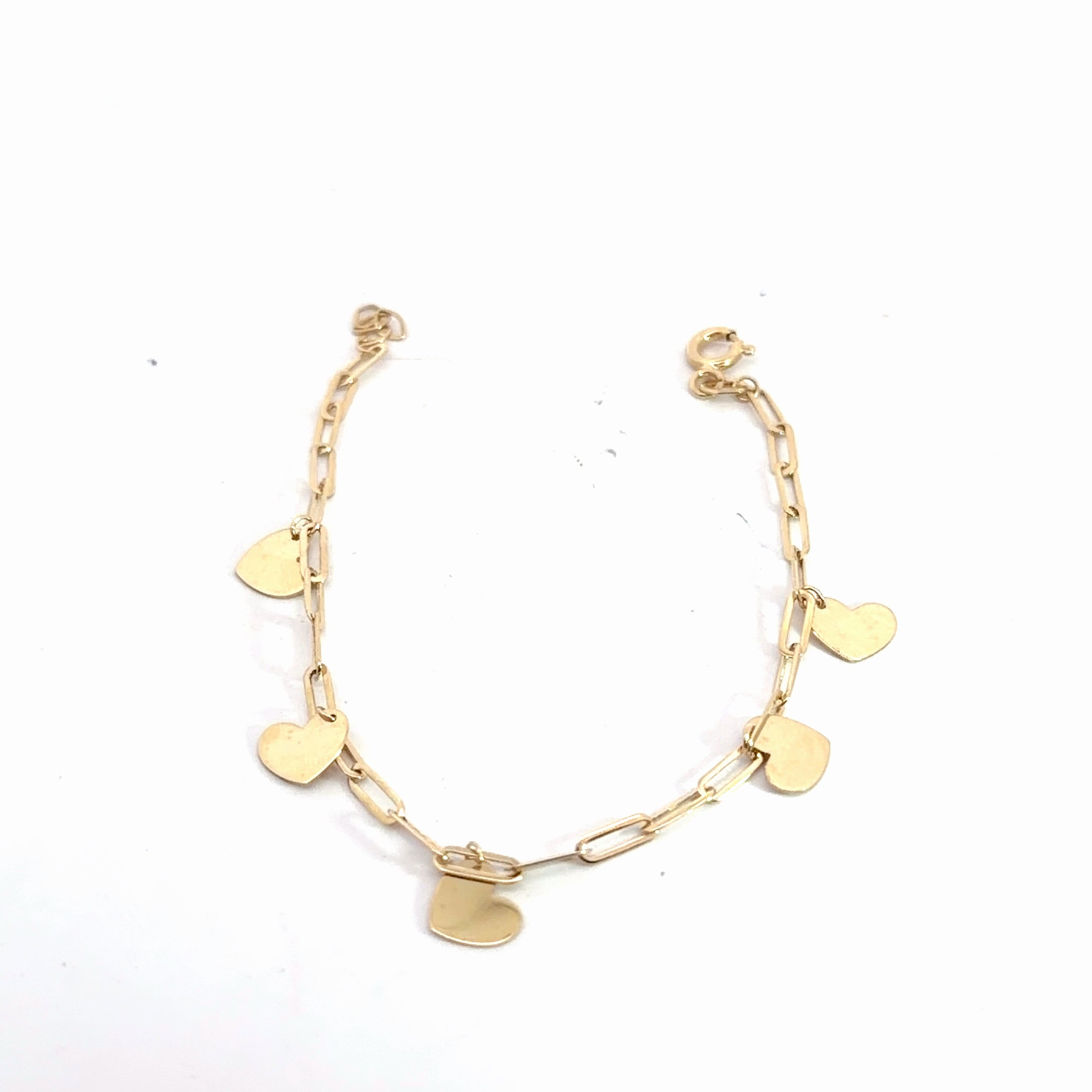 14k Yellow Gold Paper Clip Link with (5) Dangle Heart Baby Bracelet 1.7 gram 6"inch