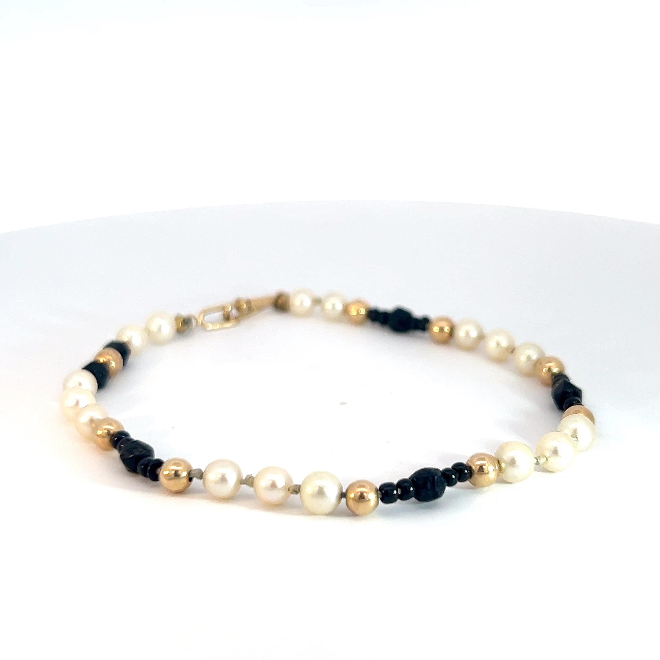 14k Yellow Gold Pearl and Onyx Beaded Bracelet 7 1/2 "inch 4.5mm