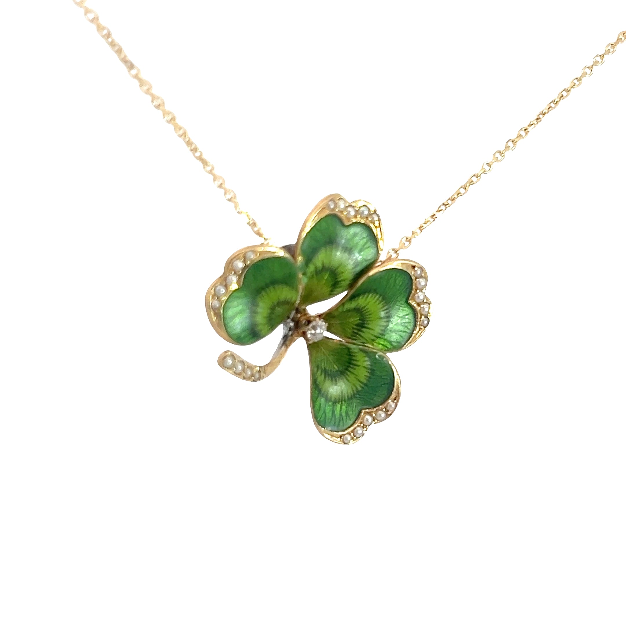 This 14k yellow gold pendant features a vintage-inspired four-leaf clover design adorned with enamel, delicate seed pearls, and a single sparkling round diamond, making it a timeless symbol of luck and elegance.