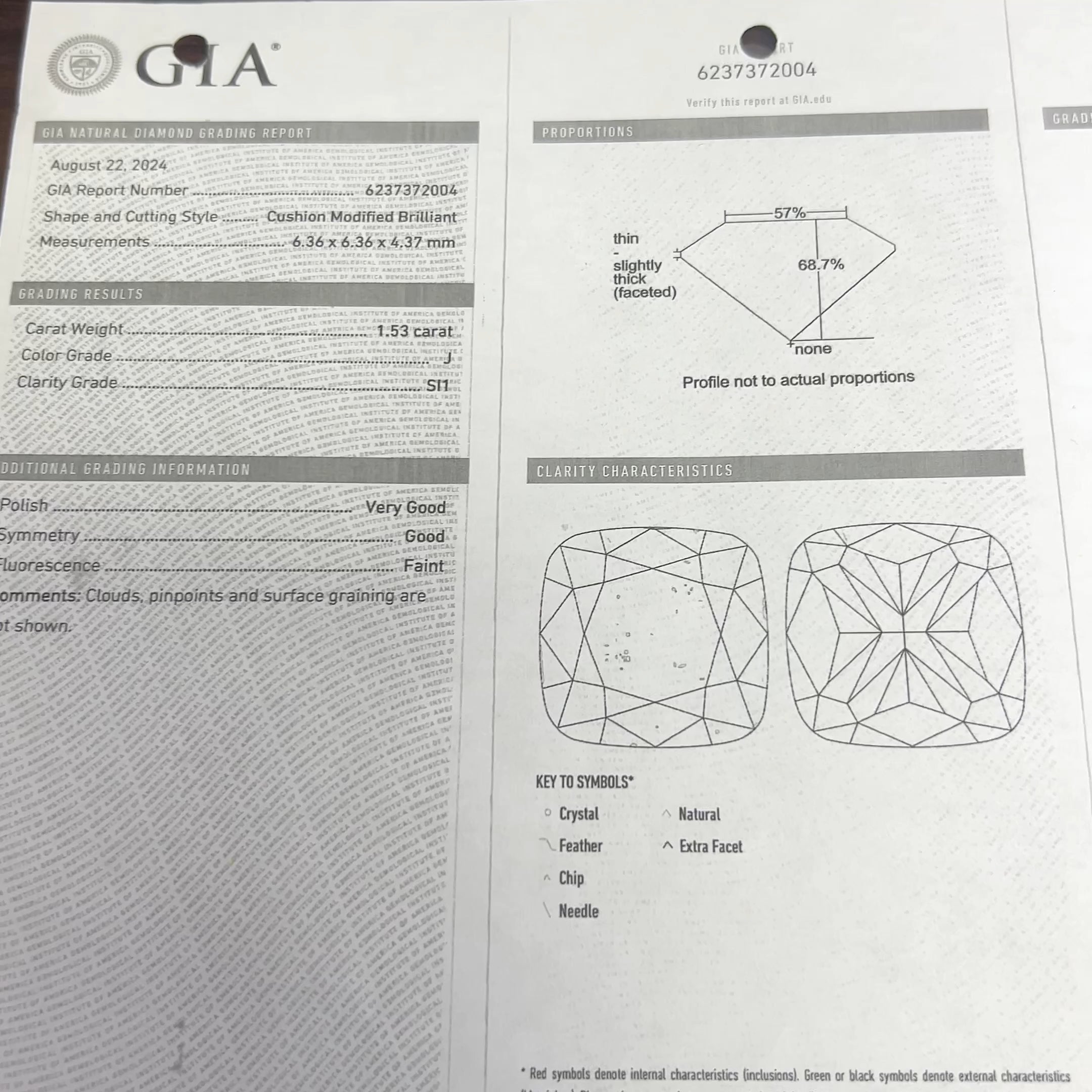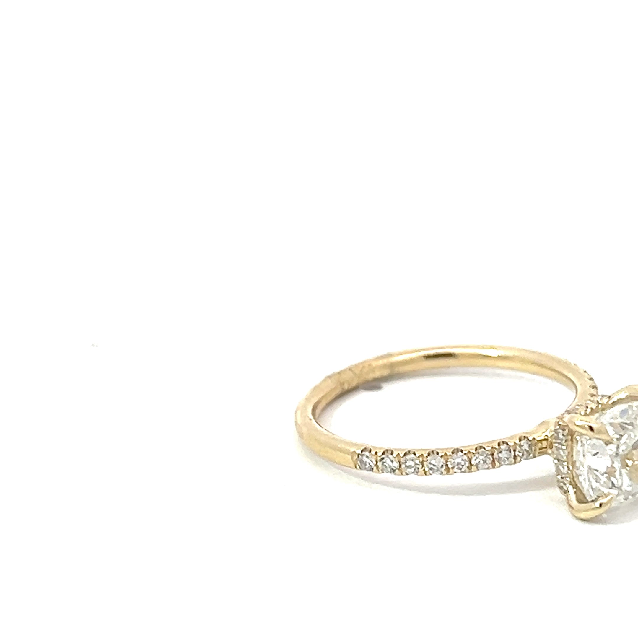 Elevate your collection with this exquisite 14k yellow gold ring featuring a stunning 1.53ct J SI1 cushion diamond complemented by a .22ct G SI1 round diamond. This remarkable piece carries the prestigious GIA certification (#6237372004), ensuring authentic quality and exceptional craftsmanship for discerning jewelry connoisseurs.