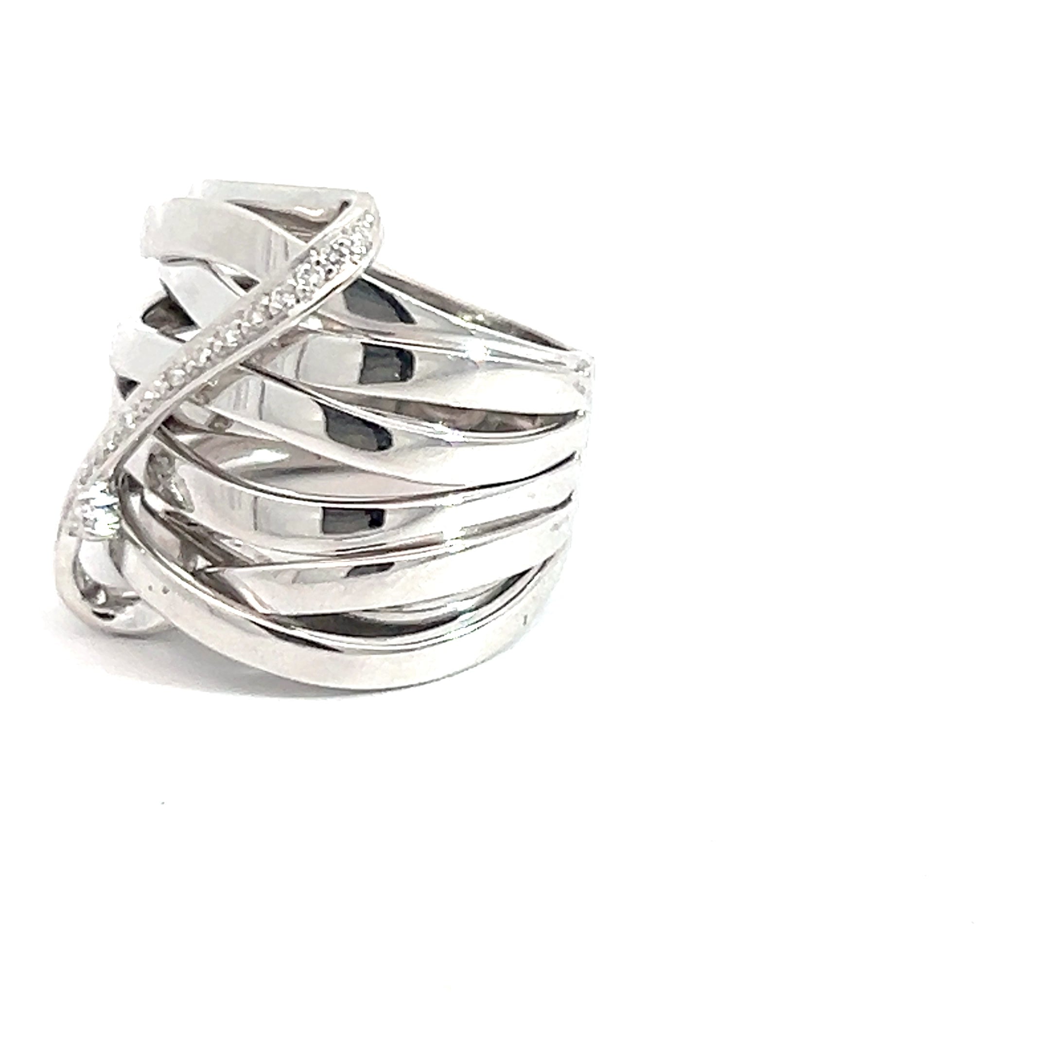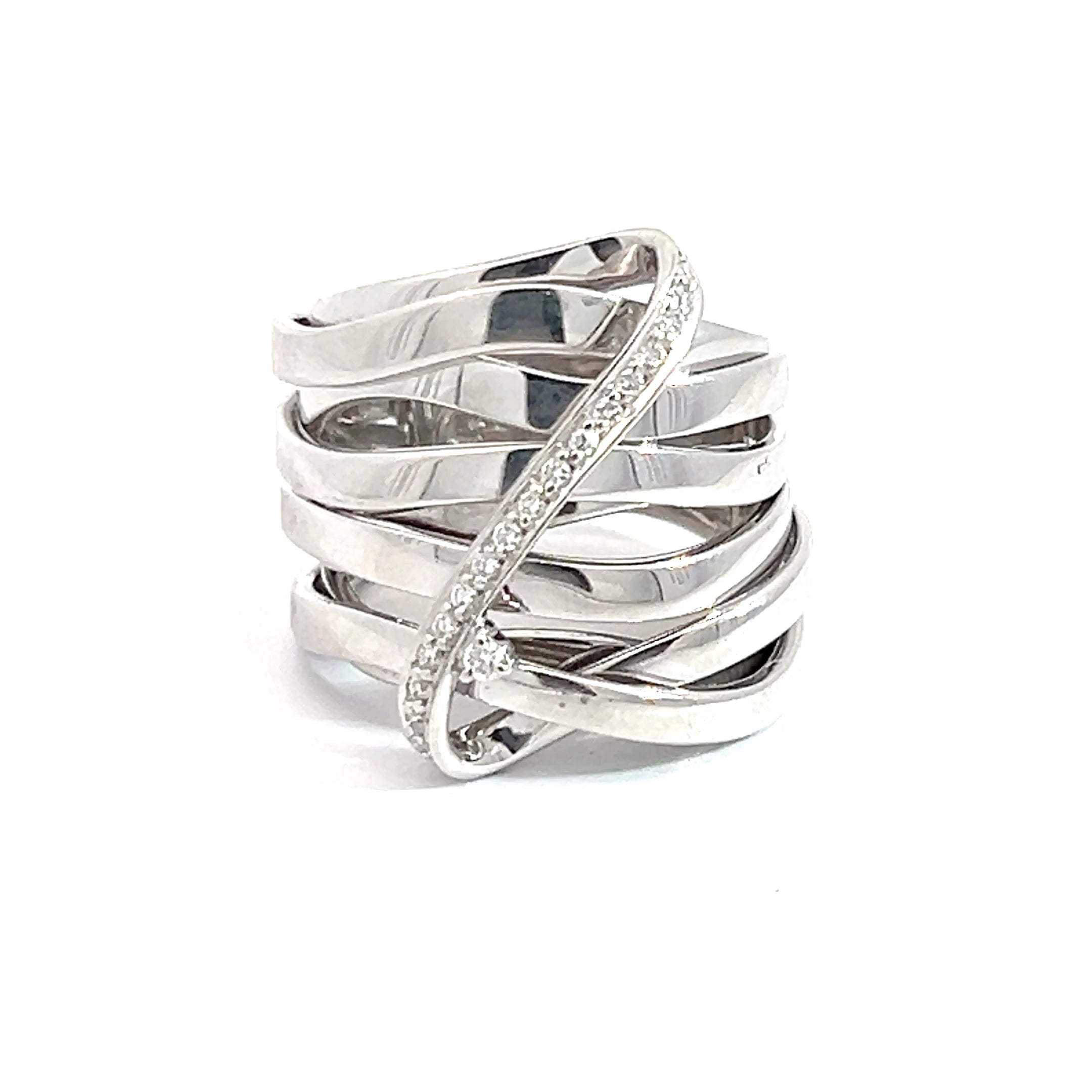 Crafted from 18k white gold, this right-hand ring features a stunning .20ct E VS2 round diamond. Weighing 11.7 grams and measuring 22mm wide, it combines elegant design with noticeable presence for a confident look.
