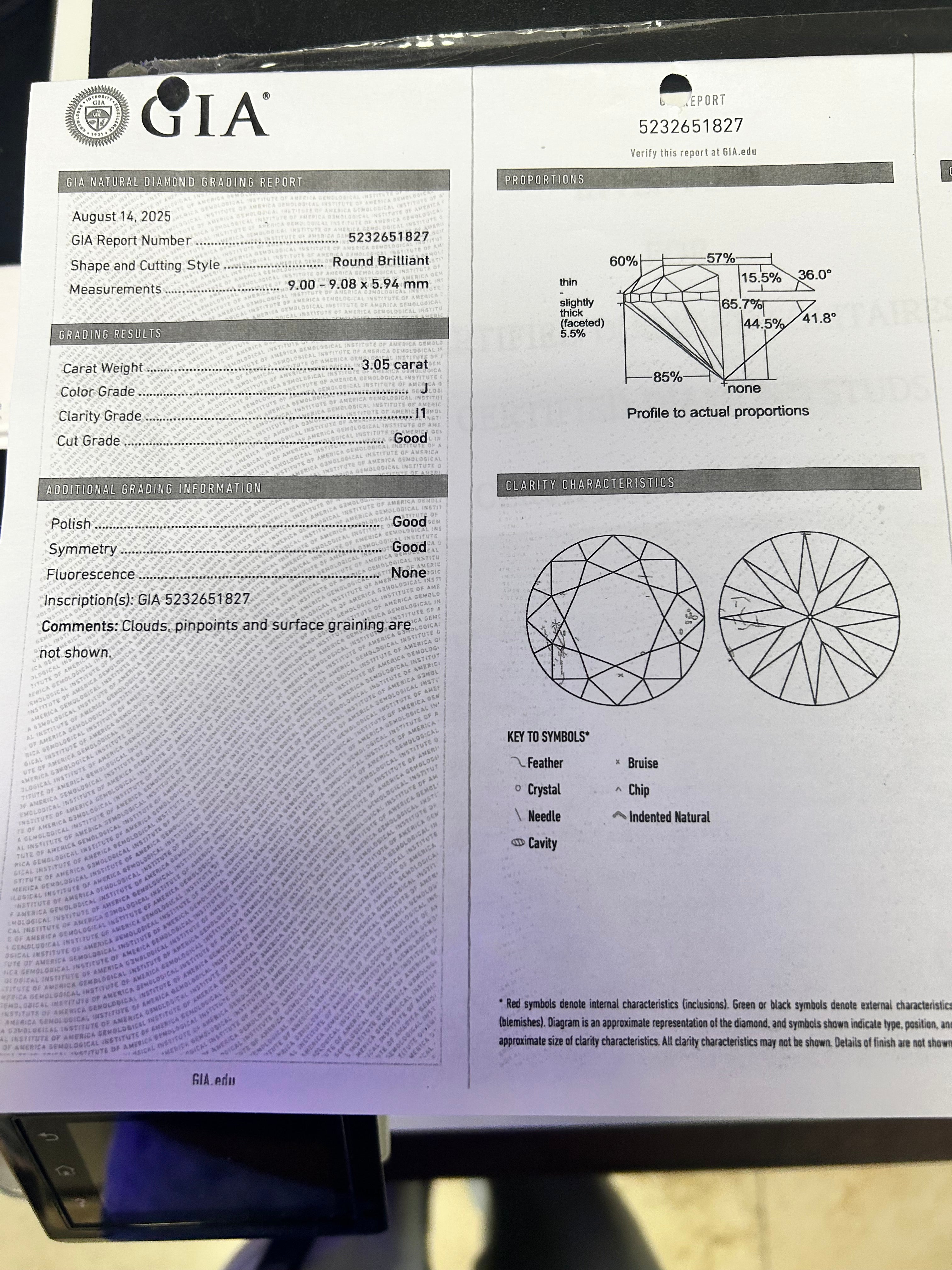 Experience timeless elegance with this platinum engagement ring featuring a stunning 3.05-carat J I1 round diamond. Accented by three tapered baguette diamonds totaling .45 carats in E VS1 clarity, this exquisite piece is certified by GIA# 5232651827, ensuring exceptional quality and brilliance. Perfect for symbolizing your everlasting commitment.
