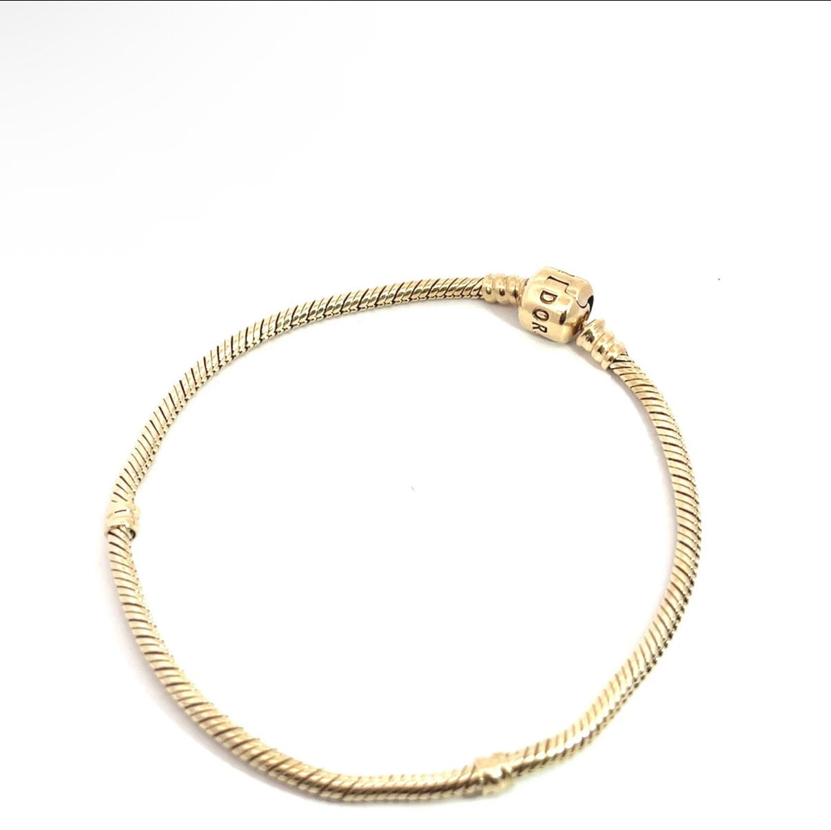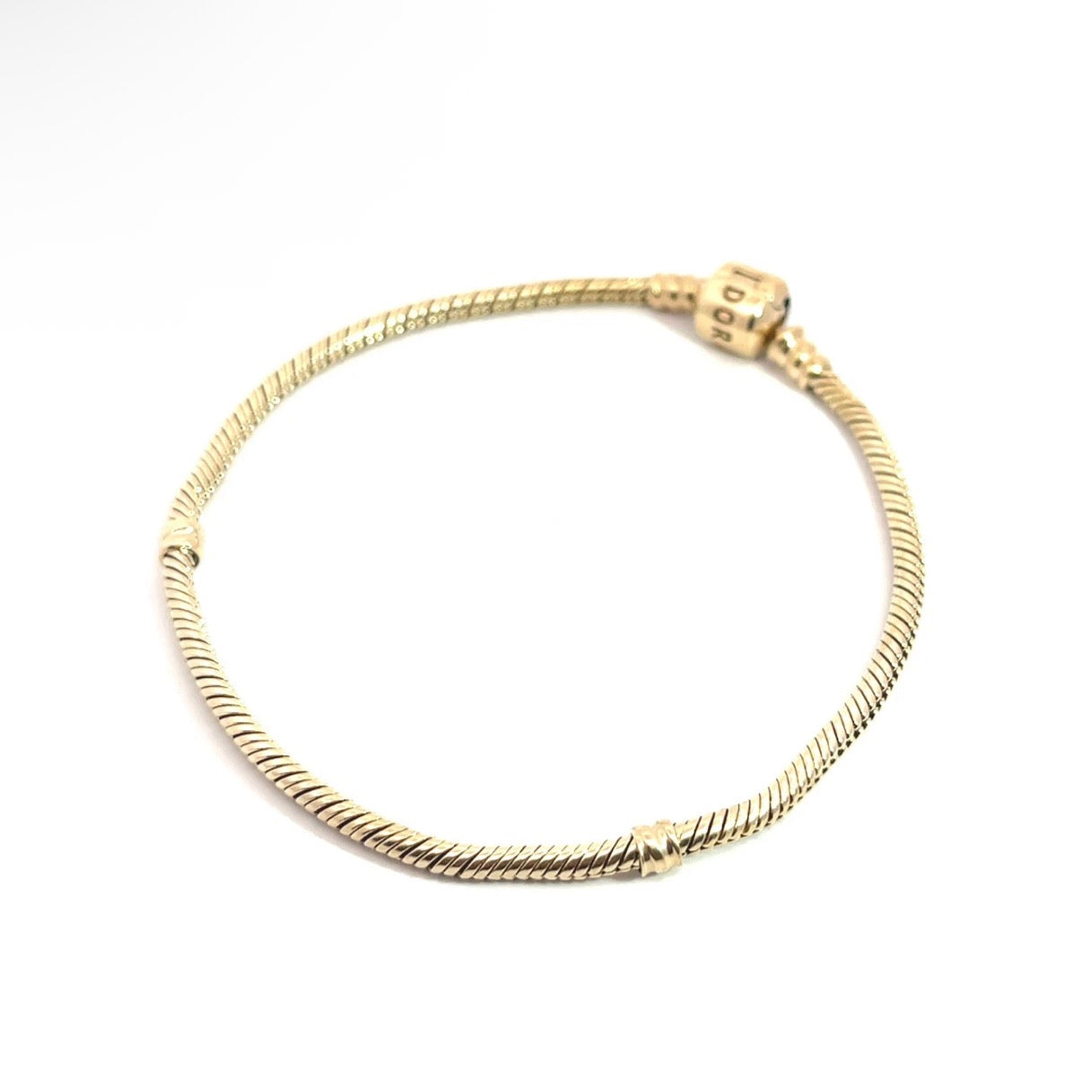 Elevate your jewelry collection with this exquisite pre-owned 14k yellow gold Pandora bracelet. Featuring a classic snake chain design and secure barrel clasp, this versatile piece seamlessly accommodates your favorite charms for endless personalization. Crafted in genuine yellow gold, it delivers timeless elegance and lasting durability. A smart choice for charm enthusiasts seeking authentic luxury at exceptional value.