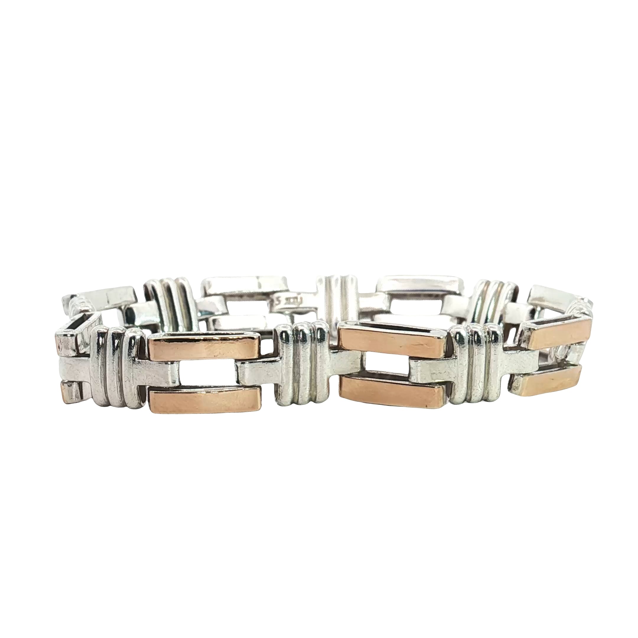 This 7-inch flat link bracelet combines sterling silver with 14k yellow gold, weighing 26.1 grams and measuring 9mm in width. Its sleek design ensures both durability and style, making it an elegant choice for everyday wear or special occasions.